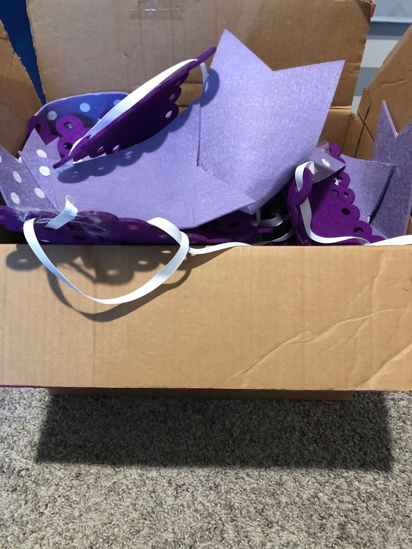 Fast forward time, I walked into our closet and saw the box of decorations from Rory’s funeral service. Lots of pretty purple banners.