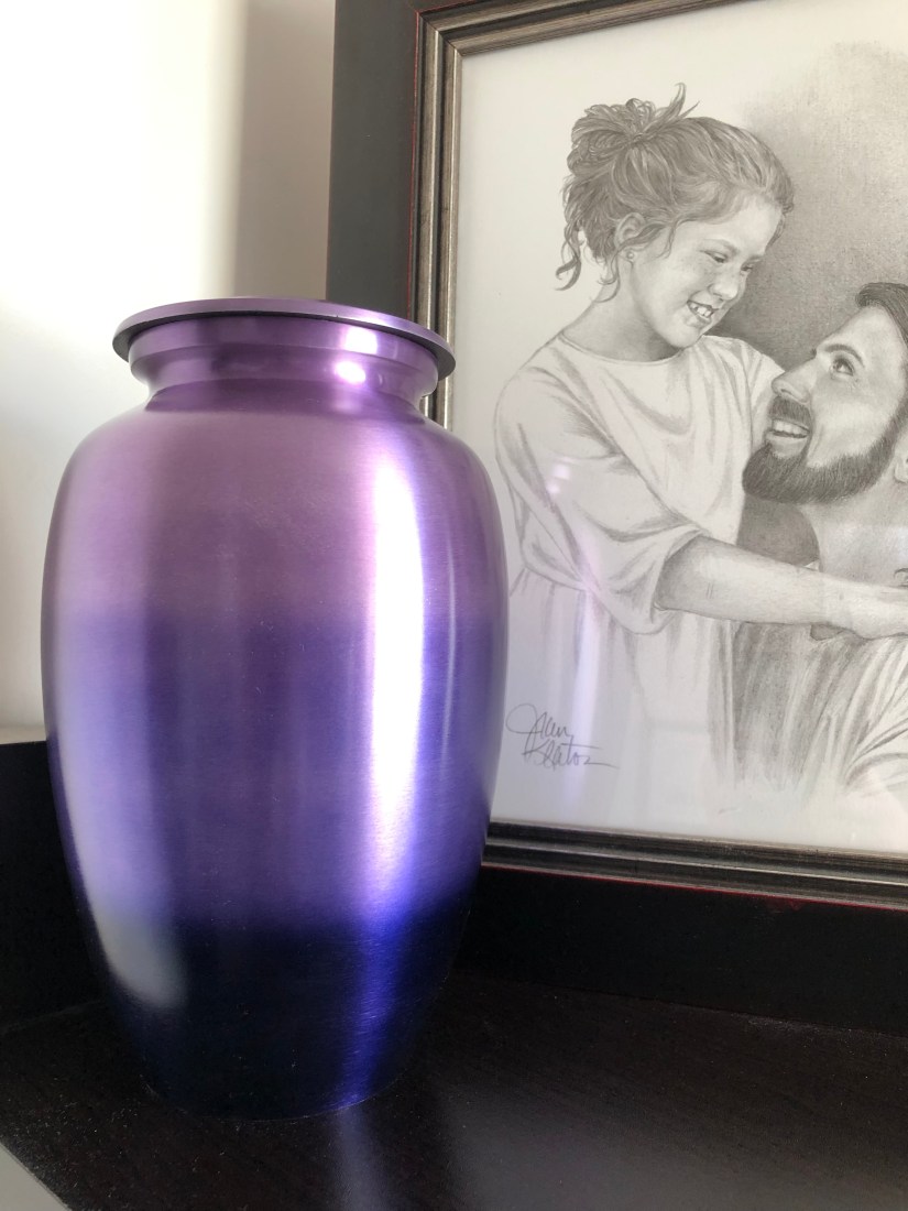 So, we picked a vibrant urn, that reminded us of her. Her resting place is with us. In our family room.